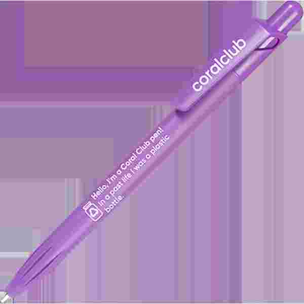 Ballpoint pen with push-button mechanism made of PET-RECYCLED material with the inscription "Hello, I'm a Coral Club pen! In a past life I was a plastic can."